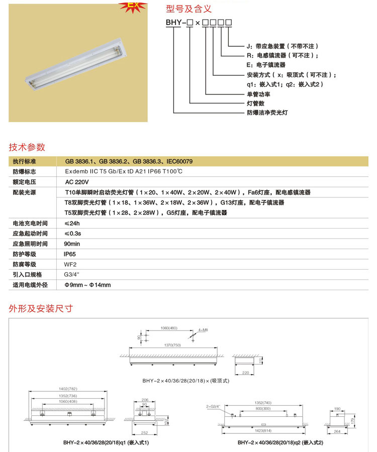 BHY-2*18W BHY-2*36W 嵌入式防爆洁净荧光灯