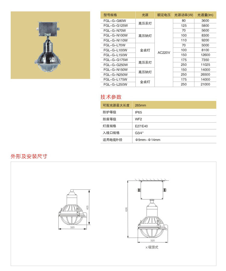 可配装白炽灯、自镇汞灯;