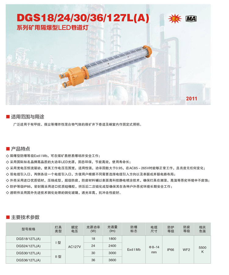 广泛适用于有甲烷、煤尘等爆炸性混合物气体的煤矿井下巷道及室内作固定式照明.