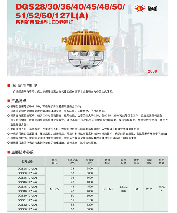 广泛适用于有甲烷、煤尘等爆炸性混合物气体的煤矿井下巷道及室内作固定式照明。