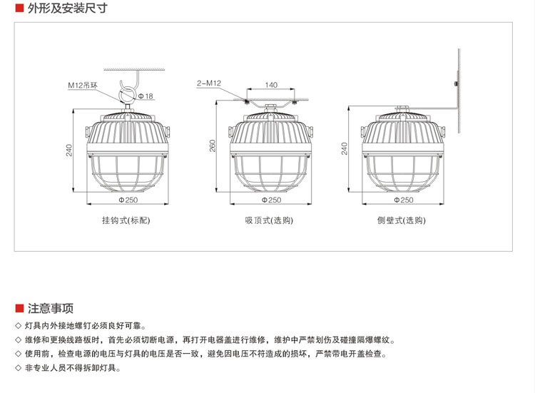◇可采用吊环式和吸壁式等安装方式,满足不同工作现场的安装需求和照明需要,操作简单方便,独立接线腔结构,使用产品维修更方便;