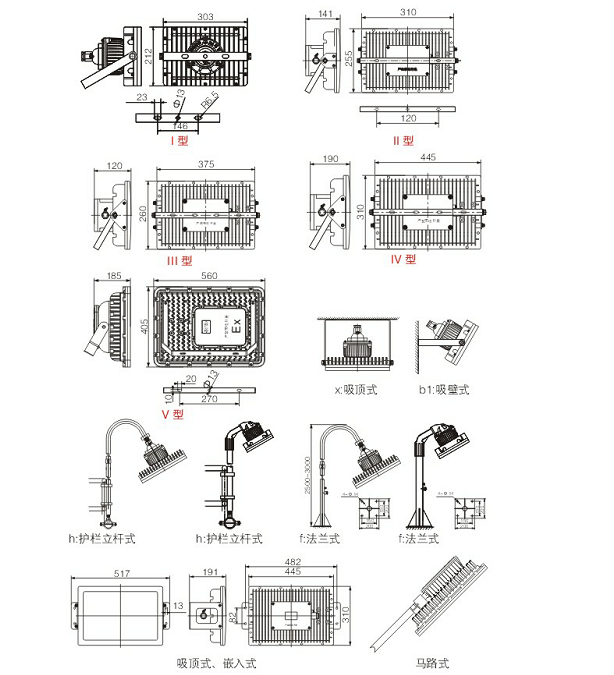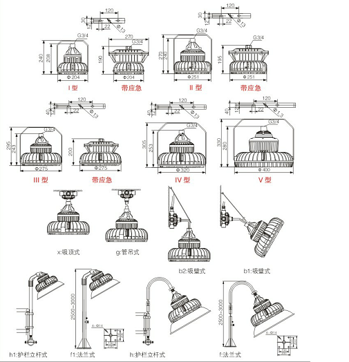 led防爆灯有吸顶式安装,壁挂式安装,支架式安装,支架式安装,管吊式安装,法兰式安装,护栏式安装,高顶式安装等多种安装方式!